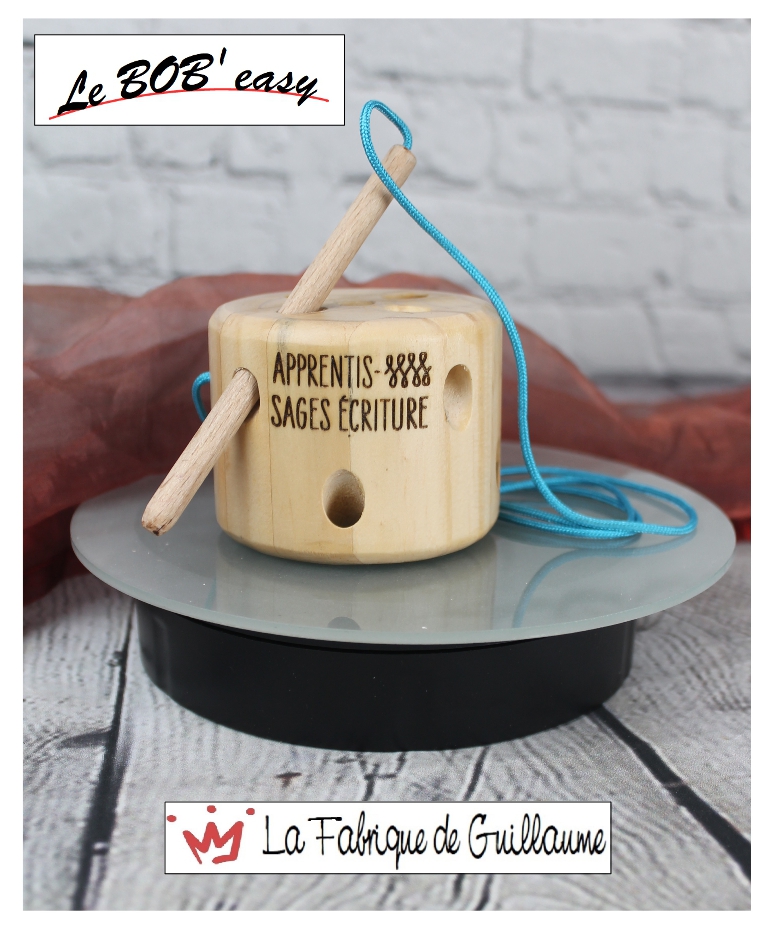 Objet fabriqué selon un cahier des charges bien précis, transmis par Nathalie Bacarisse, Directrice de formation à Apprentis-sages Écriture (taille, longueur de la corde, orientation des trous), qui permet la réalisation de l’activité de manière optimale, ce que l’on ne trouve pas dans le commerce. Autres qualités : solidité, durabilité.